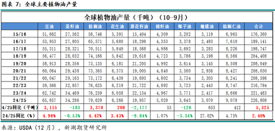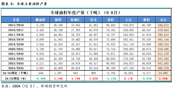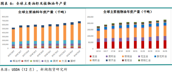 油籽方面,美国农业部(USDA)12月报告显示,24/25年度(9-8月),国际主要七种油籽产量同比上一年度继续增加,同比增幅约4%或达6.83亿吨,总产量再创历史新高。