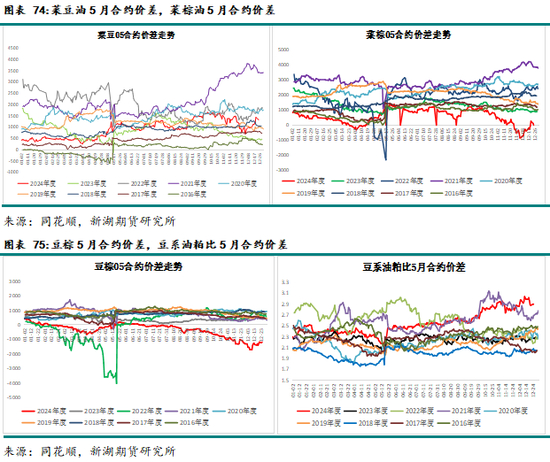 豆棕价差 :24年国内豆棕现价跌至历史次低位,国际原料端驱动为主。25年一季度,豆棕价差仍有下行驱动。一方面,棕榈油雨季、印度节日刚需采购预期、印尼出口LEVY需要上调,棕榈油仍有走强可能。另一方面,巴西新作大豆定产销售期,价格或仍有一定下行空间;25年二季度豆棕价差逻辑清晰度下降。棕榈油产地季节性增产季到来、中美关系、美国大豆面积可能有减预期,令豆棕价差下跌驱动减弱;3-4季度周期太远、变数较多,全球油籽新季产量尚不确定。