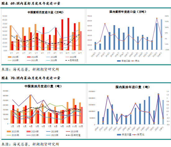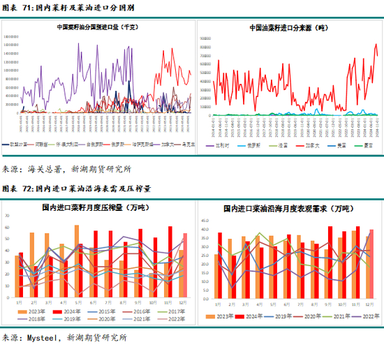 供给方面:由于国内压榨产能扩张、进口利润较好、担心政策风险到货前移,24年国内菜籽进口量预计600万吨以上,同比增约14-15%,进口量再创历史新高。国内菜油24年进口预计180万吨左右,同比减少21-22%,俄罗斯仍是国内菜油主要进口来源地。