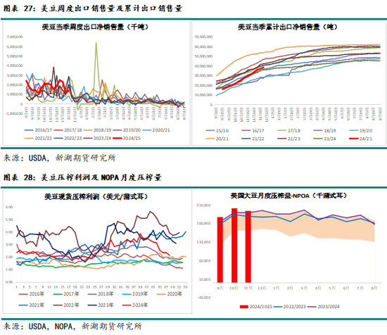 需求方面:24/25年度美豆出口销售一度非常低迷,但本季产量预期清晰后,7月开始美豆出口销售量快速回升。USDA预估美豆本年度出口同比增7.7%。在巴西大豆产量将同比大增、中国进口可能因中美关系减少背景下,后期USDA的美豆出口预估有下调空间。