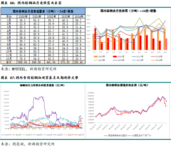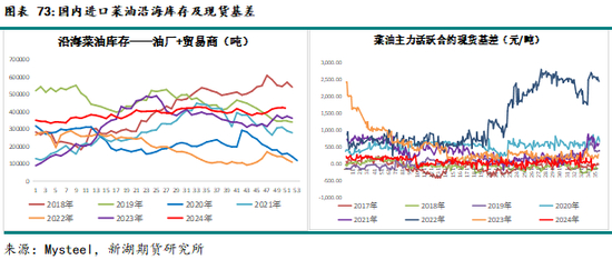 需求方面:24年国内进口菜油供需一直宽松格局,沿海库存始终运行在历史区间高位,现货基差也一直在历史最低位徘徊。国内菜油价格高于豆油,24年棕榈油可替代消费份额预计主要体现在豆油上。但进口菜油储备轮换持续进行,国内菜油沿海表需还是非常不错。
