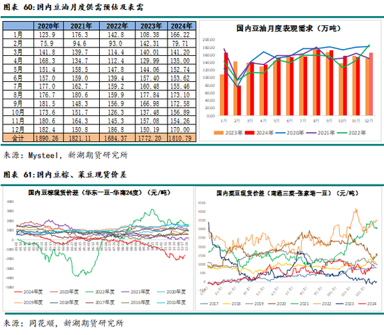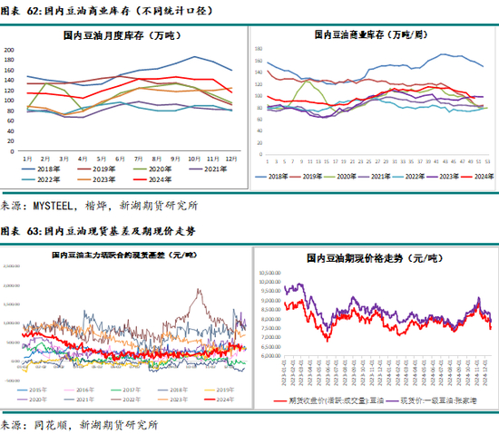 24年豆棕价差大跌,国内供需双减。基差也始终运行在历史极低水平,与2022年的表现截然不同。由于四季度进口相对刚需稍偏多,国内库存反而回升至中性水平。