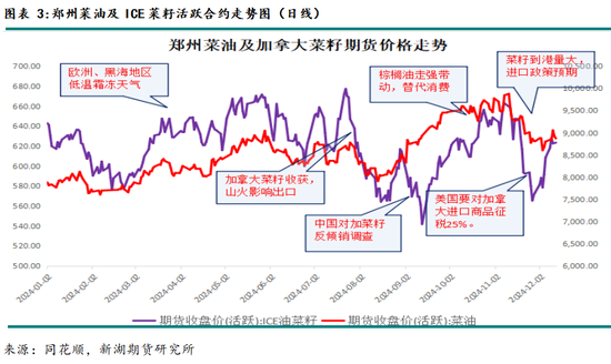 25年国内菜籽供给方面最大的不确定因素就是,中国是否、何时以及何种方式对进口的加拿大菜籽实施反倾销调查的相关措施。这取决于中加、美加关系的变化。虽然25年春节前后国内菜油供需仍宽松,但若担心风险产业迟迟没有新增菜籽采购,或中方对加菜籽反倾销措施出台,25年2、3季度国内菜油供需将逐渐紧张。因此,25年国内菜油供给形势或将由进口政策主导。