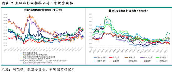 植物油方面,因油料总体继续增产,24/25年度全球9种主要植物油产量同比预计增加2.4%。四大植物油中,棕榈油及豆油产量同比预计增加4-5%。菜油及葵油同比减产,但菜油减幅很小,葵花籽油同比减幅较大约220万吨。