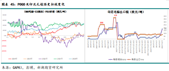 出口及需求:24年印尼棕榈油同比减产,导致国际棕榈油价格高企,加上国内生柴用量明显增加,印尼棕榈油出口明显下降。根据GAPKI数据,24年印尼毛棕及精炼合计出口预计同比减少10-12%。25年印尼棕榈油或供需增量接近(下文详述),出口可能稳中略降。