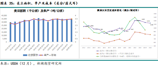 巴西大豆成本方面:2023、2024年巴西大豆增产上市阶段,巨大的供给压力导致巴西大豆出口报价及对CBOT大豆盘面升贴水显著走弱。24/25年度,巴西大豆供需压力更甚,截止12月中下旬,巴西新作大豆对外FOB报价已跌破24年前期低点。由于化肥及农药成本大幅下降、单产同比改善,24/25年度巴西大豆每蒲式耳的最低成本线同比下降。后期巴西大豆价格能否再度在成本线附近止跌,将影响巴西大豆本季盈亏及下季的种植面积。