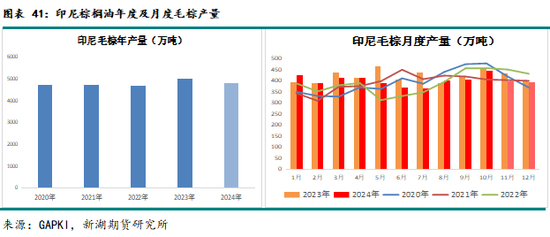 产量方面:由于23年9-10月遭遇干旱,24年5-7月印尼棕榈油产量偏低,但9-10月产量也不及预期,行业预估24年印尼棕榈油产量同比减少150-200万吨。根据GAPKI数据,24年印尼毛棕产量或至4800-4850万吨,同比减3-5%。对比往年,24年印尼产量同比减量较大,年初市场预估23年干旱或导致24年印尼减产100万吨,单最终减产程度超出行业多数人的预期。