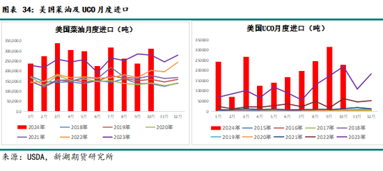 24年9月美国有官员提出《农民优先燃料激励法案》,计划将45Z这一抵免政策延长至2034年,并要求所有受益的燃料必须使用美国本土原料生产;此外,特朗普承诺将对中国商品征收60%的关税,对其他进口商品征收10-20%的关税,这将影响中国对美国UCO的出口量。2024年12月,出于行业内诉求等综合考虑,中国取消了UCO的13%出口退税;24年11月特朗普曾表示,上任后将对墨西哥和加拿大进入美国的所有产品征收25%关税,包括加拿大菜油在内。但在此之前美加双方对此其实仍有斡旋空间。后期美国是否对加拿大菜油征税及征税后对两国植物油需求的影响有待观察。