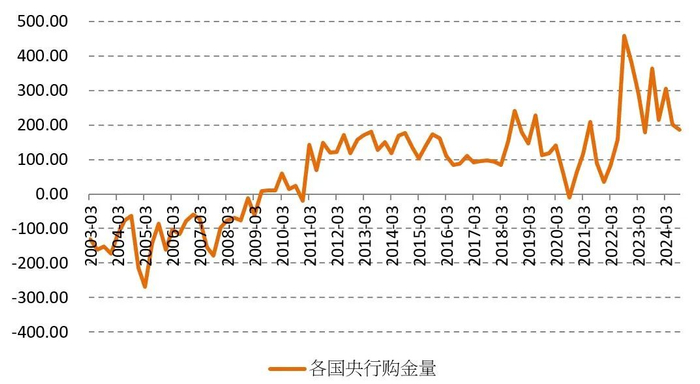 展望2025年,我们认为贵金属、有色金属受益于金融属性和供给收缩而将继续保持强劲,尤其是黄金涨势未尽,一方面美元实际利率下行提振黄金的投资需求,另一方面去美元化将继续支持各国增持黄金,在黄金需求中,近三年央行购金的占比较大幅攀升,这也就可以解释为何黄金投资需求增长不明显,黄金价格在近三年大幅上涨的现象。世界黄金协会公布的数据显示,2024年一季度,全球央行购金约为286.2吨,高于去年四季度的173.6吨。2024年上半年,各国央行购买了483吨黄金,创下新纪录。