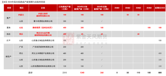 截至目前,2024年国内氧化铝新增产能实际落地共计260万吨,与年初计划的1340万吨产能相去甚远,产能落地远不达预期,多个项目延期至2025年甚至以后。