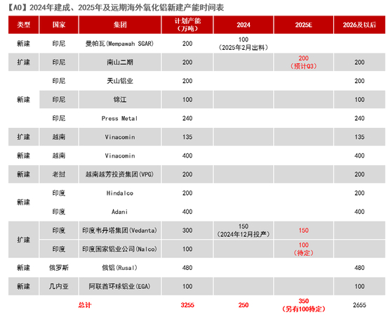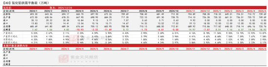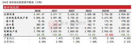 考虑前述的新投产能释放和复产,我们预计2025年海外氧化铝产量较前一年增加230万吨,同比增速4.05%。