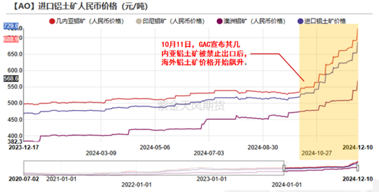 因此,海外供应紧张奠定了海外铝土矿价格走势上行的总基调。而10月几内亚GAC的铝土矿事件加剧了供需矛盾,推动矿价更加水涨船高。截止2024年12月06日,几内亚铝土矿CIF价格为95美元/吨,较10月11日上涨18美元/吨或23.28%,较年初01月02日上涨25美元/吨或35.71%;澳大利亚铝土矿CIF价格为74美元/吨,较10月11日上涨7美元/吨或10.45%,较年初01月02日上涨20美元/吨或37.04%。