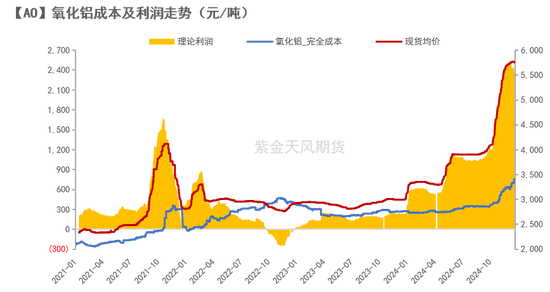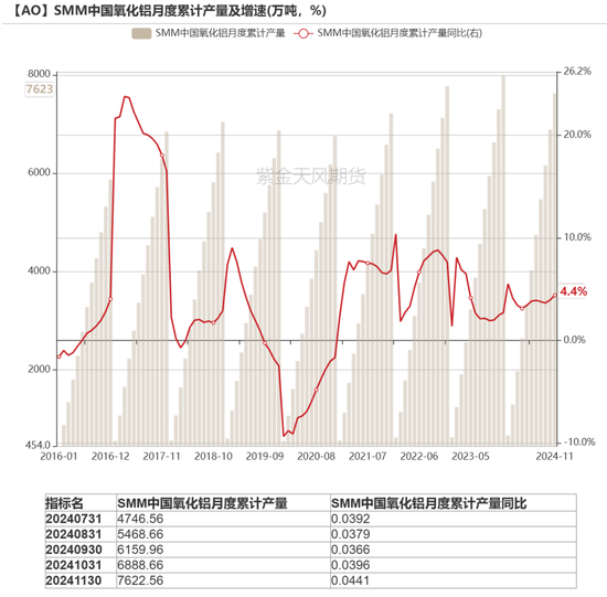 历史绝对高位的利润无法撬动产量。截止2024年11月底,氧化铝理论利润为2400元/吨左右,而前一年同期仅为220元/吨左右,同比增长愈900%。