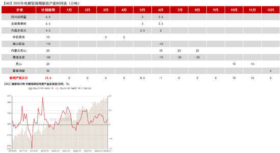 【需求】考虑减产的情况下,我们预计2025全年电解铝运行产能净增42.50万吨,电解铝产量新增94.20万吨,同比增速2.18%。分时间段来看,全年产能高位运行,在二季度和四季度末或有小幅提产可能。