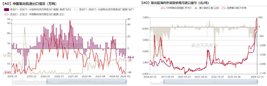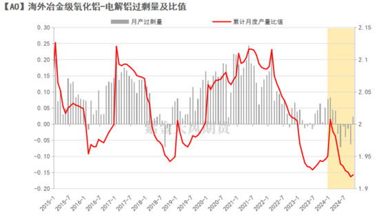 我们用公式【月产过剩量=海外冶金级氧化铝/电解铝月产比值-1.925】来衡量海外供需,过剩量持续水面上则表示供应宽松,反之同理。由于今年下游电解铝产量增速处在正常区间,导致指标时隔6年,重新持续在水面下。2024年1-10月份,海外电解铝累计产量2443.8万吨,同比增长1.20%。“月产过剩量”指标自今年年初以来一直下跌,4月从水面上陡然跌至负值,2018年10月后时隔6年再次落入-0.07以下区间。但从次轴的“累计产量比值”可以看到,供给正处于边际修复阶段。