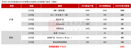 【上游】国产铝土矿方面,我们经过政策梳理,预计国产矿石难得有效增量。25年国内新增产能全部为进口矿石产线,对进口铝土矿的需求约为1420万吨(包括备库需求)。进口铝土矿方面,我们预计GAC矿石出口受限的缺口将由SMB和GIA弥补,2025年我国进口几内亚铝土矿的新增量有望达到2080-2340万湿吨,折合1765-1990万干吨,能够满足新投产需求。但需关注25年1月几内亚执政换届过渡期对矿石发运的可能影响。