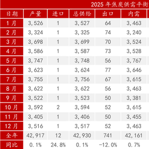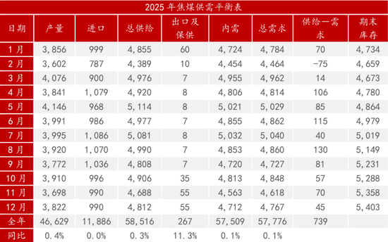表 :2025年焦炭供需平衡表