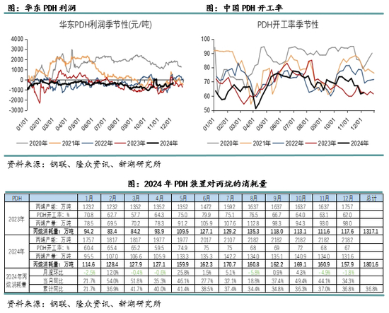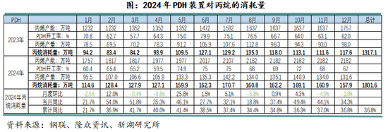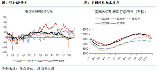 展望2025年,PDH新增产能约546万吨,且主要在上半年投放,按照63%的开工率,大概增加丙烷需求约220万吨。除了PDH装置外,轻烃裂解装置也在投产,广东惠州ExxonMobil、中石化镇海和BASF湛江,共计380万吨/年的裂解产能将在2025年上线,主要使用进口LPG。2025年,国外仅Advanced Polyolefins Company 的一套84万吨/年的PDH装置投产,因此需求增量主要看中国。