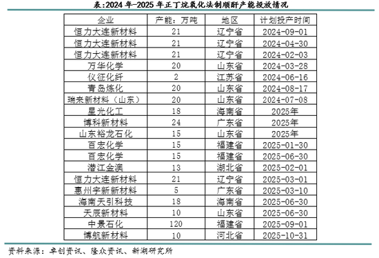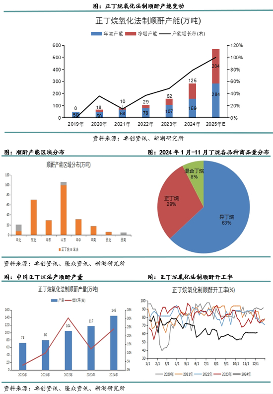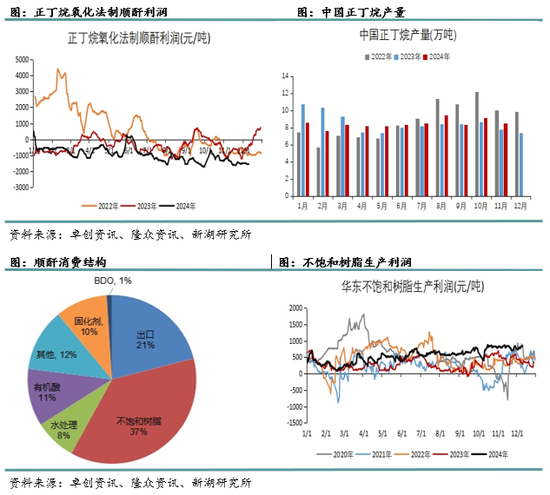 展望2025年,正丁烷氧化法制顺酐产能增加284万吨,因顺酐装置产能投产集中,近两年装置利润持续下降,因此预期2025年新投产的开工率可能不足6成。