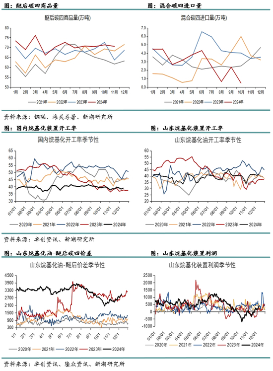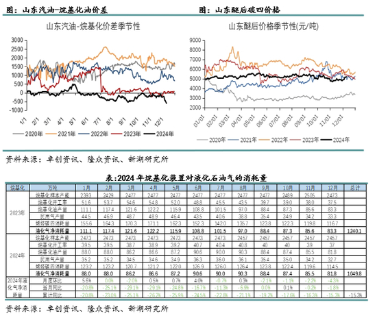 烷基化油具有低硫、辛烷值高的特点,是一种理想的汽油添加剂,多用于高标号汽油的调和,如95号、98号等。反应机理是在酸性催化剂的作用下,烷烃和烯烃发生反应,生成异辛烷,一般是异丁烷和异丁烯、丁烯-1等发生反应,原料是醚后碳四、煤制烯烃过程中的混合碳四或者乙烯副产气等。从地区分布来看,山东地区的烷基化产能最大,作为碳四深加工的最大地区,山东碳四资源难以自给自足,除从东北和华北地区补充外,也会从日韩进口一些碳四资源。2024年烷基化装置共消耗烯烃碳四约1770万吨,由于烷基化装置副产民用气,扣除民用气420万吨后,液化石油气净消耗量为1050万吨,同比下降15.3%。2024年1月至10月醚后碳四的商品量为710万吨,同比增加3.5%,混合碳四进口量为28.8万吨,同比减少30%,剩余的烯烃碳四来自于煤制烯烃和乙烯副产烯烃。山东裕龙石化的常减压投产后,加氢裂化和300万吨/年的催化裂化等装置将陆续开工,催化装置满产会带来700吨/天的碳四增量,若下游配套装置未开车,将导致碳四外放增加,约占山东醚后供应的12%。
