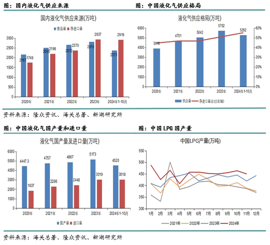 2024年1月至10月的国产量为4520万吨,其中商品量为2373万吨;2024年1月至10月进口量为3018万吨,与2023年全年进口量3019万吨仅差1万吨,2024年1月至10月出口量为99万吨,根据净进口量=进口量-出口量,2024年1月至10月净进口量为2919万吨;自2020年以来,净进口量和商品量逐年递增,根据供应量=净进口量+商品量,2024年1月至10月液化石油气供应量达到5292万吨,其中净进口量占比为55.2%。