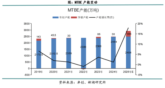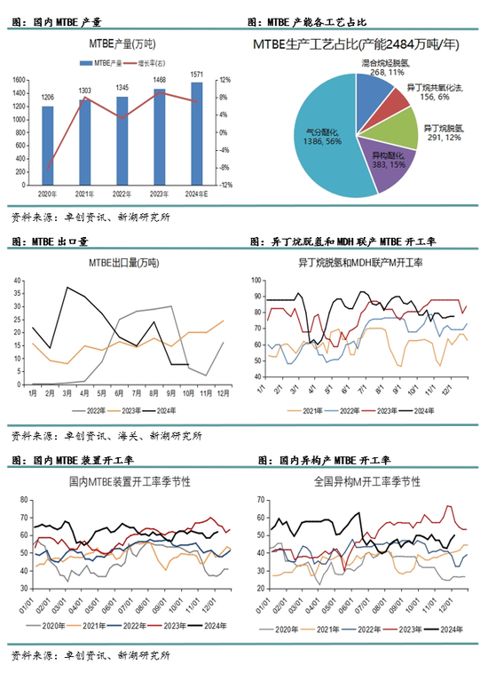 MTBE,全称是甲基叔丁基醚,是一种汽油添加剂,因为含氧量较高,所以添加比例一般控制在13%以下。生产MTBE的工艺较多,主反应是异丁烯和甲醇发生醚化反应,异丁烯可以来自于烷烃脱氢,也可以来自于烯烃异构,因此MTBE的生产工艺既包括烷烃深加工,也包括烯烃深加工。截至2024年12月,国内MTBE产能达到2484万吨,从工艺上来看,56%的MTBE产能是气分醚化工艺,其次是异构醚化,占比16%;2024年MTBE产量为1571万吨,同比增加7%。