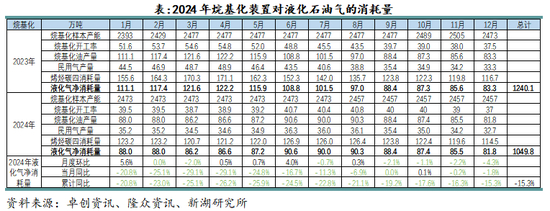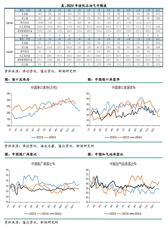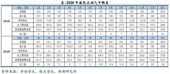 供应端,2024年LPG外放量(商品量)2855万吨,同比增加1.47%;进口量3588万吨,同比增加9.8%;出口量118万吨,同比增加30%。根据供应量=外放量+进口量-出口量,LPG 2024年总供应量6324万吨,同比增加5.6%。