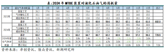 2024年,MTBE开工率同比上涨2%,尤其是上半年开工率较高,因国际MTBE需求旺盛,套利窗口打开,今年1月-10月,MTBE出口206万吨,同比增加43%。从装置利润来看,随着出口量下滑,气分醚化装置利润下滑至往年低位,烷烃脱氢和异构醚化装置,也在夏季汽油旺季结束,装置利润出现阶段性亏损。2024年MTBE装置(除异丁烷共氧化法产MTBE)消耗液化石油气约730万吨,同比增加7%。分工艺来看,脱氢联产MTBE消耗丁烷370万吨,同比增加12.7%,气分醚化工艺消耗液化石油气186.8万吨,同比增加1.2%,烯烃异构联产MTBE消耗液化石油气173万吨,同比增加2.3%。