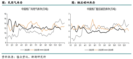 沙特的Jafurah页岩气田将在2025或2026年投产,2030年达到最大产出,LPG产量为950万吨/年。卡塔尔North Field Expansions气田将在2025年投产,LPG产能770万吨/年,此外阿联酋MERAM气田,拥有200万吨/年的LPG产能,也将在2025年投产。印度的LPG消费补贴惠及750万LPG用户,补贴计划持续到2025年3月。今年1月-10月,印度LPG需求量同比增加7%,进口量增加175万吨,增幅约12%。后期需关注印度补贴计划是否延续,这将影响印度的需求增量,进而对CP价格产生影响。