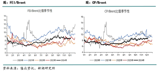 虽然LPG与原油高度相关,但基于自身的基本面,LPG和原油的波动幅度有差异。2024年第一季度,燃烧需求逐月减少,且PDH装置进入检修季,FEI/Brent比值震荡下行,5月份加通湖进入雨季,但绝对水位仍然偏低,VLGC没有优先通行权,通行拍卖费偏高,海运费继续上行,导致进口成本上涨,因此FEI/Brent比值震荡走强。8月份开始,贸易商开始为冬季囤货,导致第三季度FEI/Brent比值继续走高。自11月开始,PDH装置检修增加,虽然开始进入燃烧旺季,但因贸易商已经提前囤货,导致进口需求表现一般,因此FEI/Brent比值震荡走弱,该时期,FEI-CP价差出现负值,主要是印度的燃烧需求较强。明年需关注沙特阿美Jafursh天然气项目投产情况,一旦该项目投产,沙特的LPG预期供应增加,满产为950万吨/年。