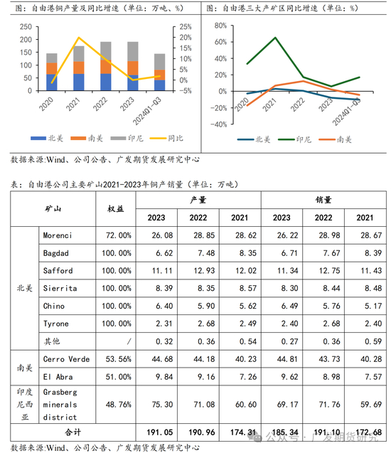自由港(Freeport-McMoRan)为全球最大的铜矿企业之一,成立于1987年,总部位于美国亚利桑那州凤凰城,拥有大量已证实和可能的铜、金和钼矿产储量。2023年自由港公司铜产量约占全球开采铜总产量的6%,2023年开采的铜分别以铜精矿(51%)、阴极铜(27%)和铜棒(22%)的形式销售,铜产品占公司整体业务收入的比例约为75%。