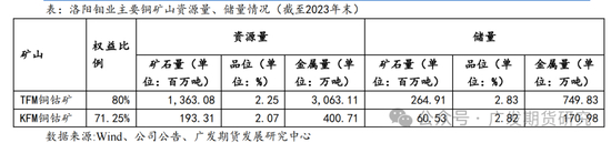 KFM铜钴矿位于刚果(金)卢阿拉巴省卢布迪区,2020年,洛阳钼业以5.5亿美元收购KFM铜钴矿95%权益,而后又出让部分权益给宁德时代旗下子公司,目前持有KFM铜钴矿71.25%权益。KFM为世界罕有的高铜高钴矿,目前拥有15万吨铜生产能力,截至2023年末拥有铜资源量400.71万吨,品位2.07%,铜储量170.98万吨。洛阳钼业收购KFM铜钴矿后,于2023年第二季度顺利投产。2024年,TFM混合矿三条生产线如期实现产量、质量“双达标”,全面转入运营期。