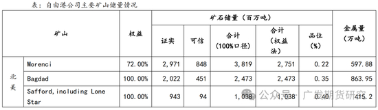 Morenci为露天铜矿综合体,位于美国亚利桑那州格林利县,自1939年以来一直在持续运营。自由港公司持有Morenci铜矿72%股份,其他股份由住友金属矿业持有。Morenci铜矿为斑岩铜矿床,截至2023年末,共有铜储量约597.88万吨,品位0.22%。Morenci铜矿为北美地区最大的铜产地,每天能处理13.2万吨矿石,2021年-2023年矿山年产铜分别为9亿磅(约40.8万吨)、9亿磅和8亿磅(约36.3万吨)。