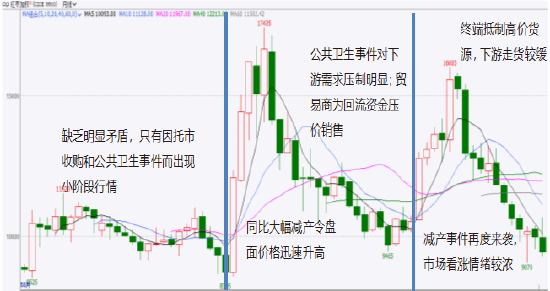 虽然春节后的2-4月有部分补货需求存在,但下游的实际承接力度较为有限,期现价格维持震荡偏弱走势。随后端午节前的备货需求对盘面形成一定支撑,而在阶段性备货需求结束后,红枣市场的交易氛围再度转冷,此时盘面交易逻辑转向新年度红枣的预期供应情况。6月上旬枣树进入集中环割阶段,头茬花坐果普遍好于去年同期。同时由于上年枣价较好,令今年枣农的管理积极性增加,至此红枣新年度或将丰产的消息传入市场,盘面受此影响加速下探。随后7-9月间在南疆部分地区遭遇冰雹天气,但对整体产量影响有限,盘面继续交易丰产预期并一度跌至9000元/吨。