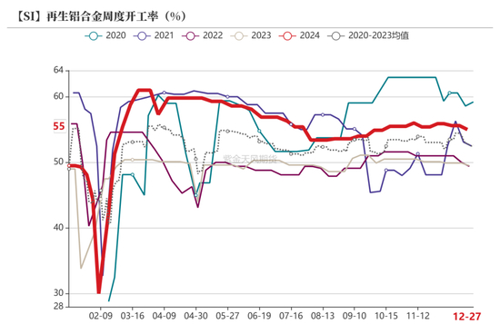 • 上周再生铝合金开工率环比减少0.6个百分点至55%,原生铝合金开工率环比减少0.6个百分点至55%。