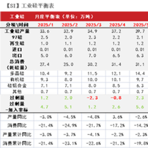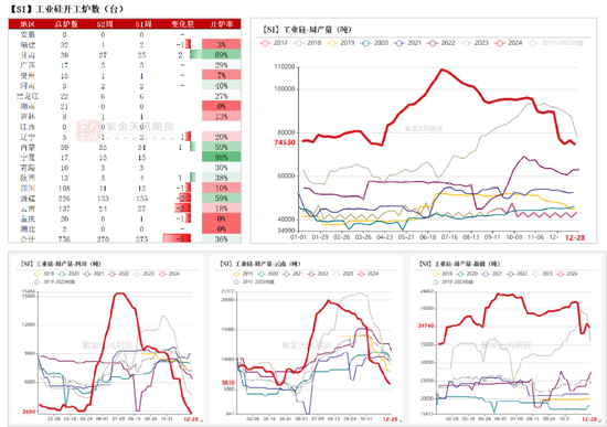 • 上周全国周产量环比继续减少,低品位工业硅价格持续偏弱。开炉方面,上周西北地区开炉数变化不大,西南开工持续减少,四川、云南、重庆开炉数分别减少1、3、1台。