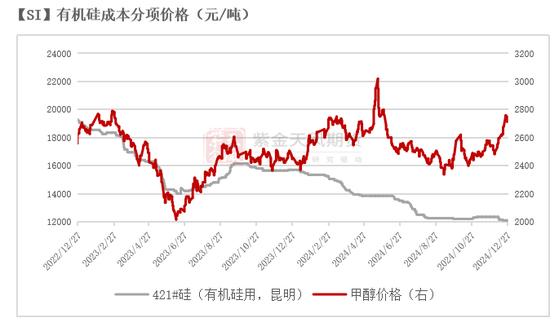 • 原料端,甲醇市场价格重心上移,买兴氛围由强转弱;有机硅厂与421#生产厂家多为长单签订,工业硅价格波动不大。较12月20日,工业硅421#(有机硅用)价格环比持平于12100元/吨,甲醇价格环比上涨35.84元/吨至2711.67元/吨。