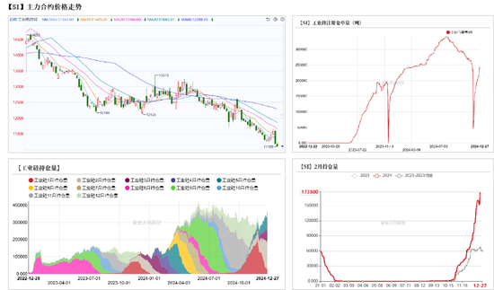 • 上周总结:上周工业硅盘面先扬后抑,多晶硅期货上市对市场情绪短暂提振,但随后周四盘面大幅增仓下行,期价价格持续创新低。现货市场承压运行,临近年前备货,市场成交量略有回升,但整体库存压力未有明显改善。供应端,上周全国开炉数整体下调,川、滇两地开工率继续降低,西北产能缓慢释放,其中新疆地区因环保原因可能导致部分停炉。需求端,多晶硅厂家在行业自律约束下主动减产检修,但下游支撑仍偏弱,市场供需失衡的局面缓解仍需时日,尽管多晶硅期货上市以来市场关注度走高,但盘面定价逻辑尚需验证,短期内期货价格预计延续宽幅震荡。有机硅市场持稳运行,临近年前备货节点,厂家开工负荷较高,短期内有机硅价格稳中有上探趋势。铝合金开工率平稳波动,对工业硅需求暂无太大变化。整体来看,西南主产区产量基本已压制历史最低位,周度总产量减幅也已较为明显,但基于需求疲弱,价格难言彻底企稳,或可优先考虑以西南丰水期生产成本区间为支撑位参考,后续关注下游复产情况,以及工业硅新疆大厂的复产进度。