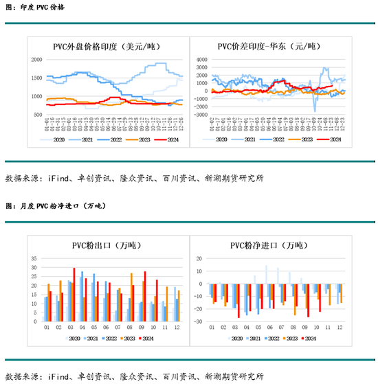 需求方面,2025年PVC需求仍将受到房地产行业低迷的拖累。房屋新开工面积累计同比下降约22%,对PVC的需求影响显著。若政策出台进一步刺激房地产投资或城中村改造项目加速推进,将为市场预期提供一定支撑,但终端需求疲弱的现状仍难以发生实质性。出口方面,印度BIS认证政策的实施可能对中国PVC出口造成冲击,尤其是在2024年底认证生效后,印度市场的需求可能明显减少。总体来看,2025年PVC将面临内需和外需均不振的状况。