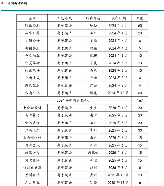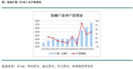 氯碱行业属于限制类行业,但由于废盐利用等政策,近几年烧碱产能增速。2022年烧碱产能4870万吨,其中新增产能395万吨,增速8.83%;2023年烧碱产能5050万吨,其中新增产能180万吨,增速3.70%。2024年烧碱产能5217万吨,其中新增产能167万吨,产能增速3.31%。2025年烧碱产能预期5692万吨,其中新增产能475万吨,产能增速9.10%。