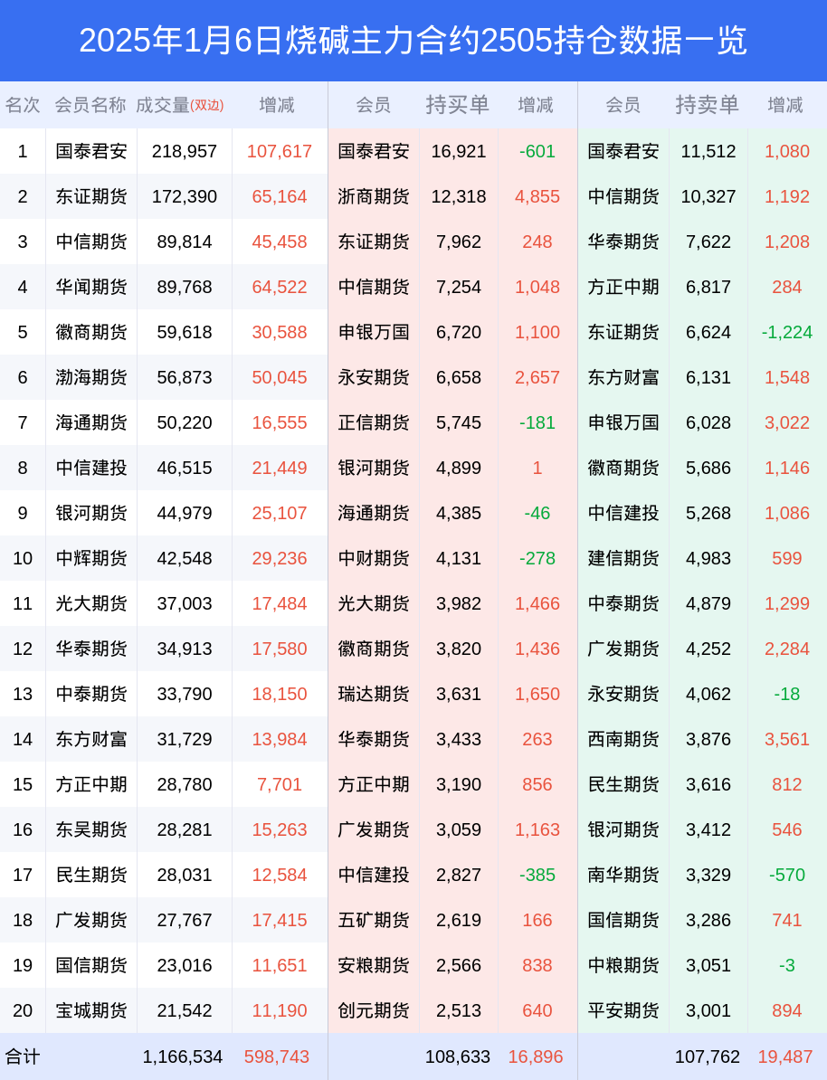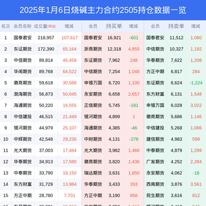 新浪期货 根据交易所数据,截至1月06日收盘主力合约烧碱2505,涨跌+4.43%,成交量91.91万手,持仓数据显示前20席位呈现净多,差额头寸为871手。