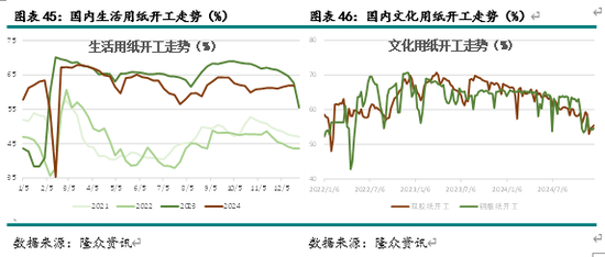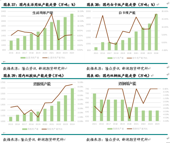 截至2024年底,造纸产能已经达到高位。从纸浆下游来看,木浆消耗比例较高的纸类有双胶纸、双铜纸、生活用纸和白卡纸,其中双胶纸、生活用纸和白卡纸均处于产能投放周期之中。2024年白卡纸产能增速预计达到18%,年底产能将达到1900万吨/年以上;生活用纸产能预计将接近2300万吨/年,产能增速在6%以上;文化纸行业中双胶纸产能投放达到120万吨/年以上,产能增速接近9%。双铜纸产能投放仍相对匮乏。部分2024年新产能投放时间在下半年,装置产量处于爬坡阶段,因此供应增量在2025年产量中将有进一步体现。