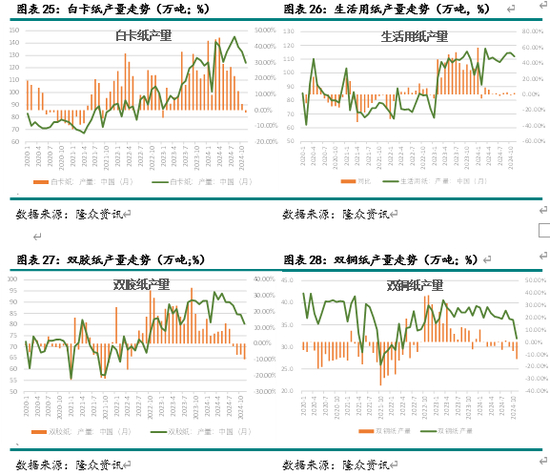 未来造纸产量增长风险主要来自利润方面,2024年造纸企业利润水平下滑为主,除铜版纸在新增供应较少的情况下,价格相对坚挺,利润维持高位,其他的生活纸、双胶纸和白卡纸利润均处于亏损状态,对造纸工厂开工造成负面影响,如果后期利润不佳状态持续,将对2025年造纸需求增速不利。