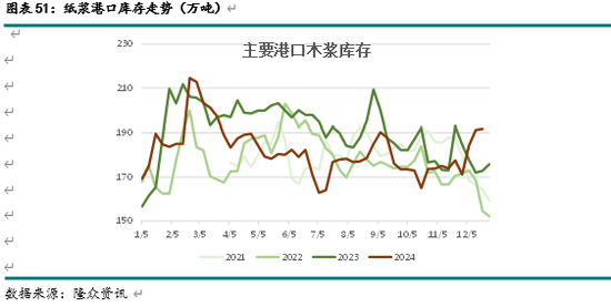2024年年初纸浆港口库存处于高位,二、三季度期间,受进口供应减少等因素影响,库存得到有效去化,直至四季度初期,库存低于2023年同期,但年底进口回升,国内下游旺季则迟迟未有体现,港口库存累至同比偏高水平,截至2024年12月19日,青岛、常熟、高栏、天津和日照等主要港口库存总和达到191万吨以上。从后期来看,2025年供应有增长空间,国内下游虽有造纸产能投放,但受限于终端需求以及库存情况,上游纸浆库存是否能去化仍有待观察。
