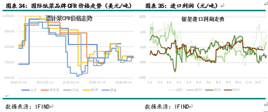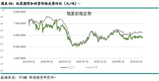 2024年下半年针阔价差大幅回升,目前在偏高水平,从后期来看,2024-2025年全球木浆新增以及处于爬坡阶段的产能仍以阔叶浆装置为主,阔叶浆供应有增加预期,因此,2025针阔价差继续走强可能性更大。