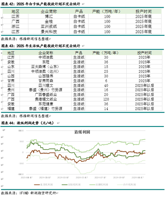 2025年造纸新产能投放延续,木浆主要下游行业中,除铜版纸已经多年缺乏新增产能外,双胶纸、白卡纸以及生活用纸仍将有较大规模的产能投放预期,其中,双胶纸产能投产预期在170万吨/年,集中在华中和华南地区,白卡纸投产预期可能达到400万吨/年,集中在华东和华南地区,生活新产能分布相对分散,计划产能预计在150-200万吨/年以上。