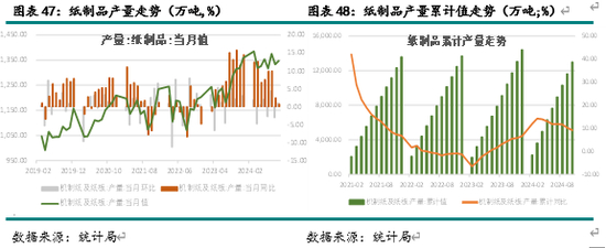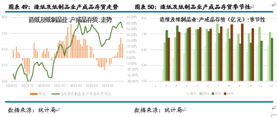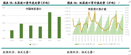 2024年造纸及纸制品行业终端产成品存货逐步展现累库趋势,2024年一季度存货处于同比偏低水平,但二至四季度随着宏观预期的弱化,终端采购不足,产业链存货同比转向累库,以10月的纸品价格作为对比,2024年10月生活纸和文化纸价格均低于2023年同期,而2024年10月的存货金额同比增加12%以上,说明相对前一年的10月,2024年四季度的市场存货数量相对更高,虽然其中存在着纸品以及纸制品产量同比增长因素的影响,但也说明大量的上中游供应并未完全进入到终端消费者,而是累积到了库存端。