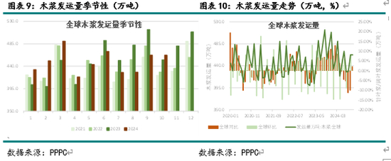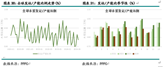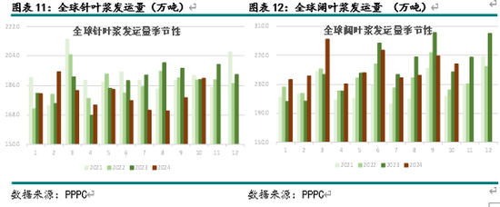 分类别来看,全球木浆发运量中,阔叶浆比例2024年微增至56%,针叶浆发运同比下滑,导致占比缩小。