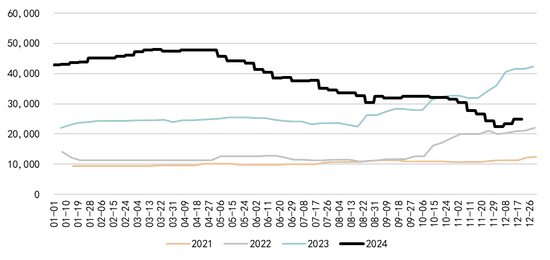工业硅成本年内保持下降趋势,且整体持续低于同比。虽然成本下降,但由于硅价全年承压,行业利润水平紧贴盈亏平衡线附近波动,后半年大部分时间行业利润水平处于亏损状态。