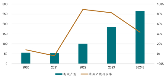 2024年预计全国多晶硅有效产能约265万吨,较上年增加80万吨,增量与去年接近,但是增速有明显放缓。光伏产业链的连续负反馈下,诸多新投产能被推迟和取消。